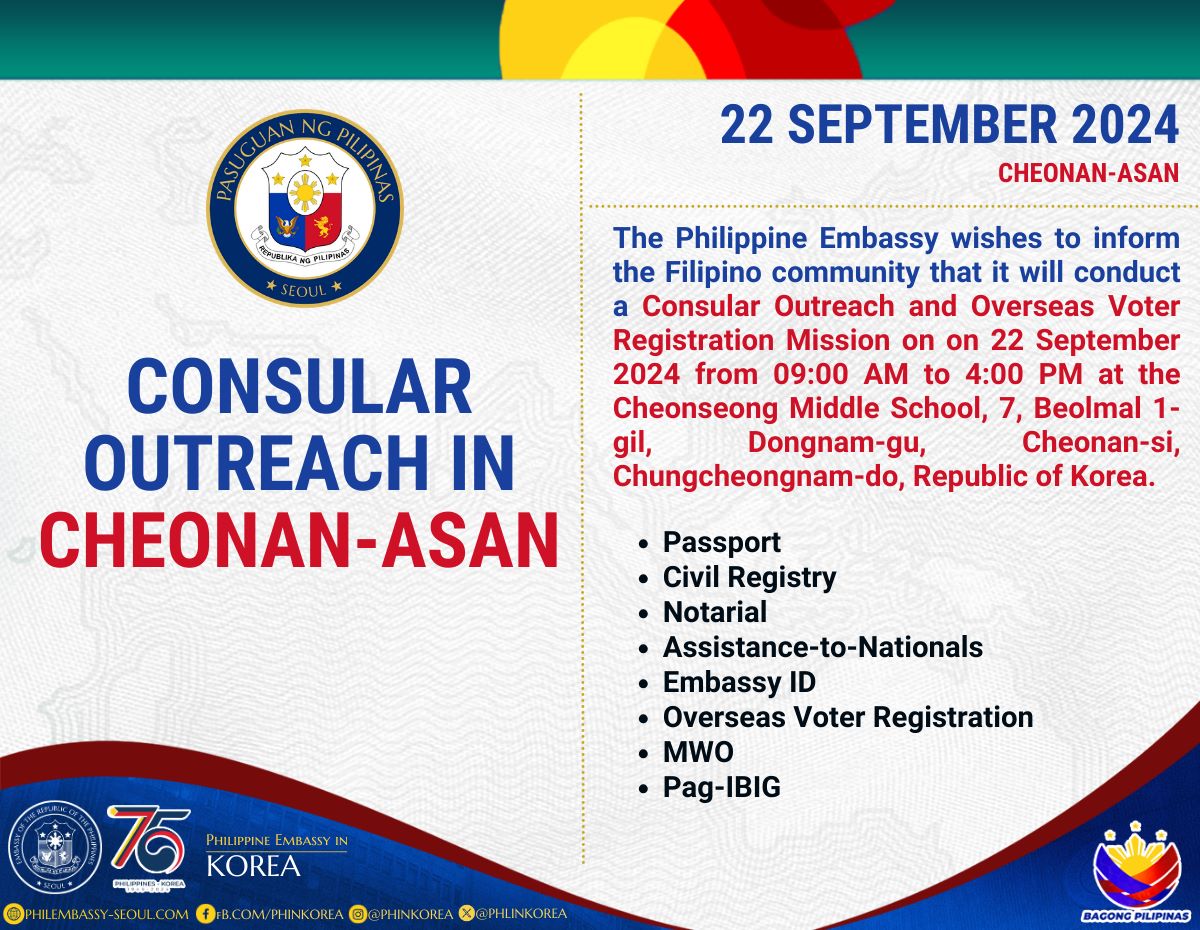 The Philippine Embassy wishes to inform the Filipino community that it will conduct a Consular Outreach and Mobile Overseas Voter Registration Mission on 22 September 2024 from 09:00 AM to 4:00 PM at the Cheonseong Middle School, 7, Beolmal 1-gil, Dongnam-gu, Cheonan-si, Chungcheongnam-do, Republic of Korea.
