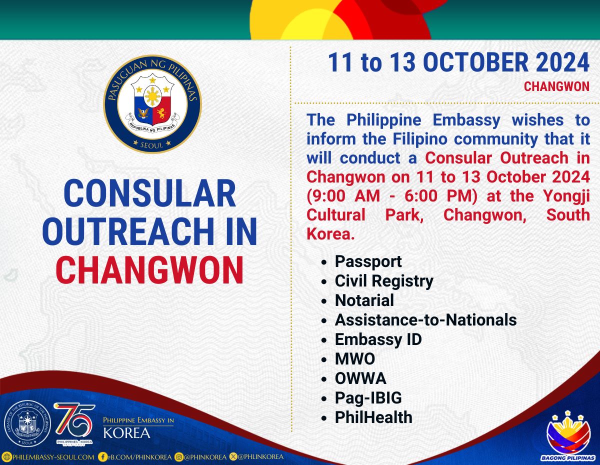 The Philippine Embassy wishes to inform the Filipino community that it will conduct a Consular Outreach in Changwon on 11 to 13 October 2024 (9:00 AM - 6:00 PM) at the Yongji Cultural Park, Changwon, South Korea. The following guidelines shall be observed: