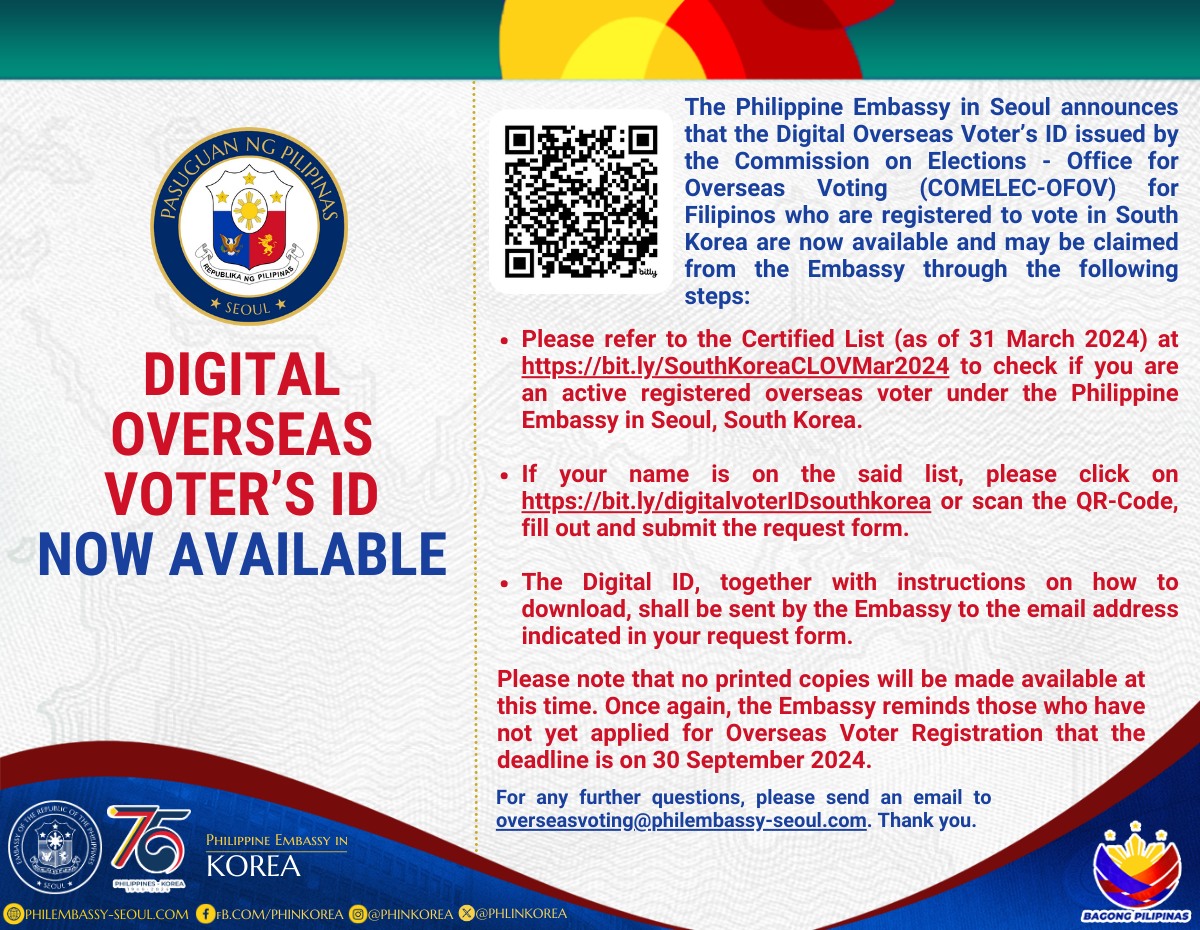 The Philippine Embassy in Seoul announces that the Digital Overseas Voter's ID issued by the Commission on Elections - Office for Overseas Voting (COMELEC-OFOV) for Filipinos who are registered to vote in South Korea are now available and may be claimed from the Embassy through the following steps:
