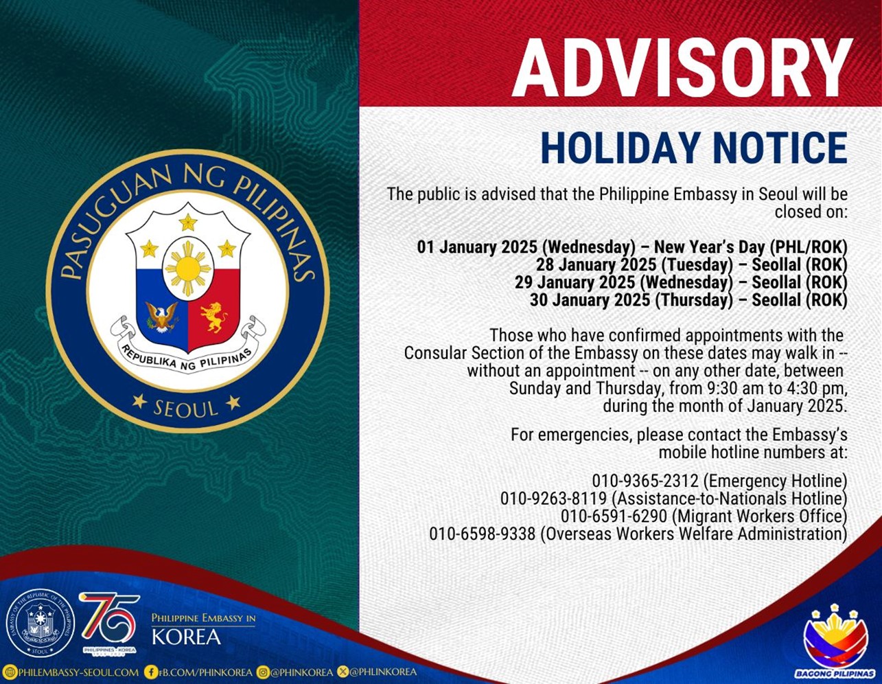 The public is advised that the Philippine Embassy in Seoul will be closed on: