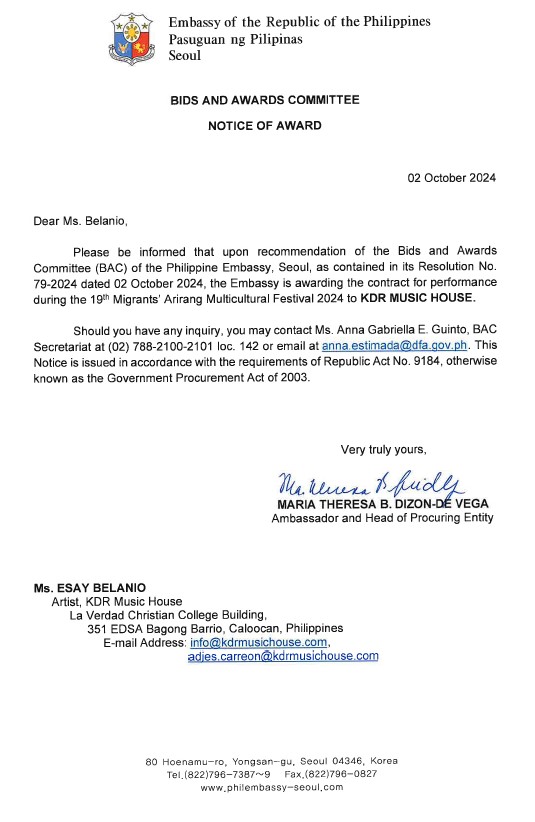 Please be informed that upon recommendation of the Bids and Awards Committee (BAC) of the Philippine Embassy, Seoul, as contained in its Resolution No. 79-2024 dated 02 October 2024, the Embassy is awarding the contract for performance during the 19th Migrants' Arirang Multicultural Festival 2024 to KDR MUSIC HOUSE.