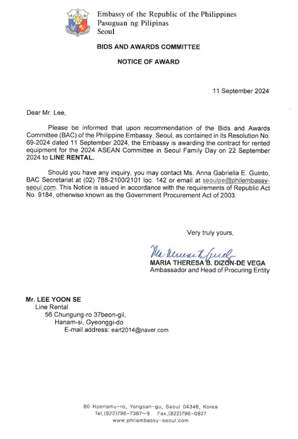 Please be informed that upon recommendation of the Bids and Awards Committee (BAC) of the Philippine Embassy, Seoul, as contained in its Resolution No. 69-2024 dated 11 September 2024, the Embassy is awarding the contract for rented equipment for the 2024 ASEAN Committee in Seoul Family Day on 22 September 2024 to LINE RENTAL.