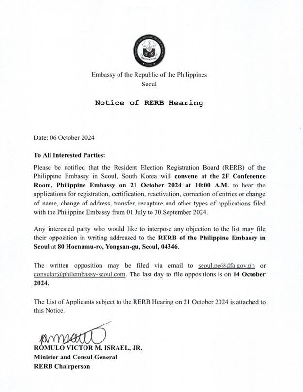 Please be notified that the Resident Election Registration Board (RERB) of the Philippine Embassy in Seoul, South Korea will convene at the 2F Conference Room, Philippine Embassy on 21 October 2024 at 10:00 A.M. to hear the applications for registration, certification, reactivation, correction of entries or change of name, change of address, transfer, recapture and other types of applications filed with the Philippine Embassy from 01 July to 30 September 2024.
