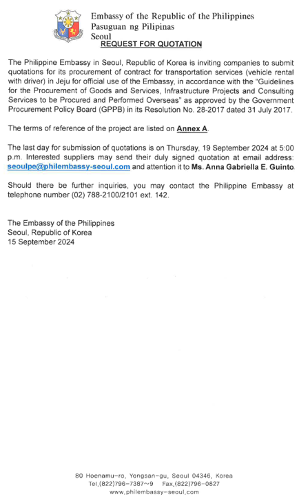 The Philippine Embassy in Seoul, Republic of Korea is inviting companies to submit quotations for its procurement of contract for transportation services (vehicle rental with driver) in Jeju for official use of the Embassy, in accordance with the "Guidelines for the Procurement of Goods and Services, Infrastructure Projects and Consulting Services to be Procured and Performed Overseas" as approved by the Government Procurement Policy Board (GPPB) in its Resolution No. 28-2017 dated 31 July 2017.