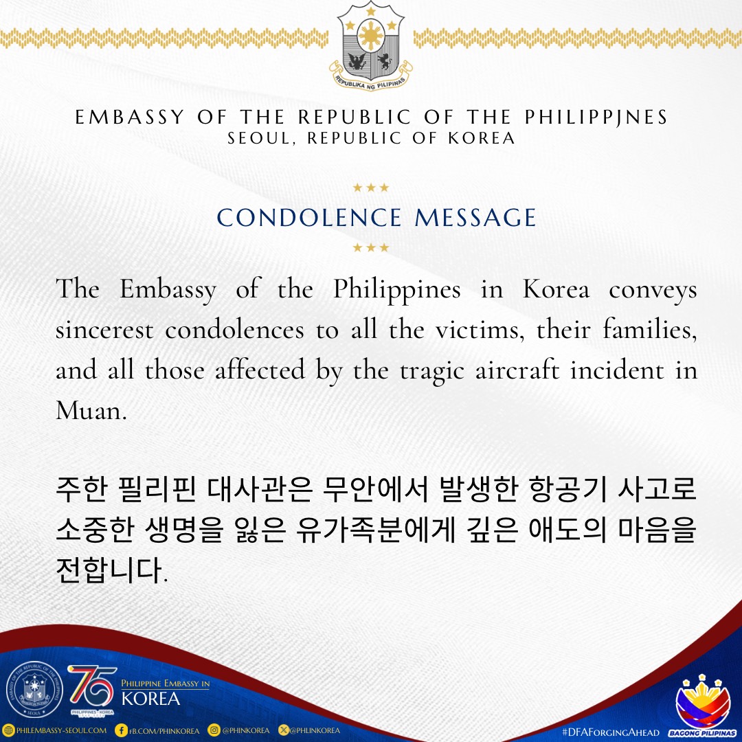 The Embassy of the Philippines in Korea conveys sincerest condolences to all the victims, their families, and all those affected by the tragic aircraft incident in Muan.